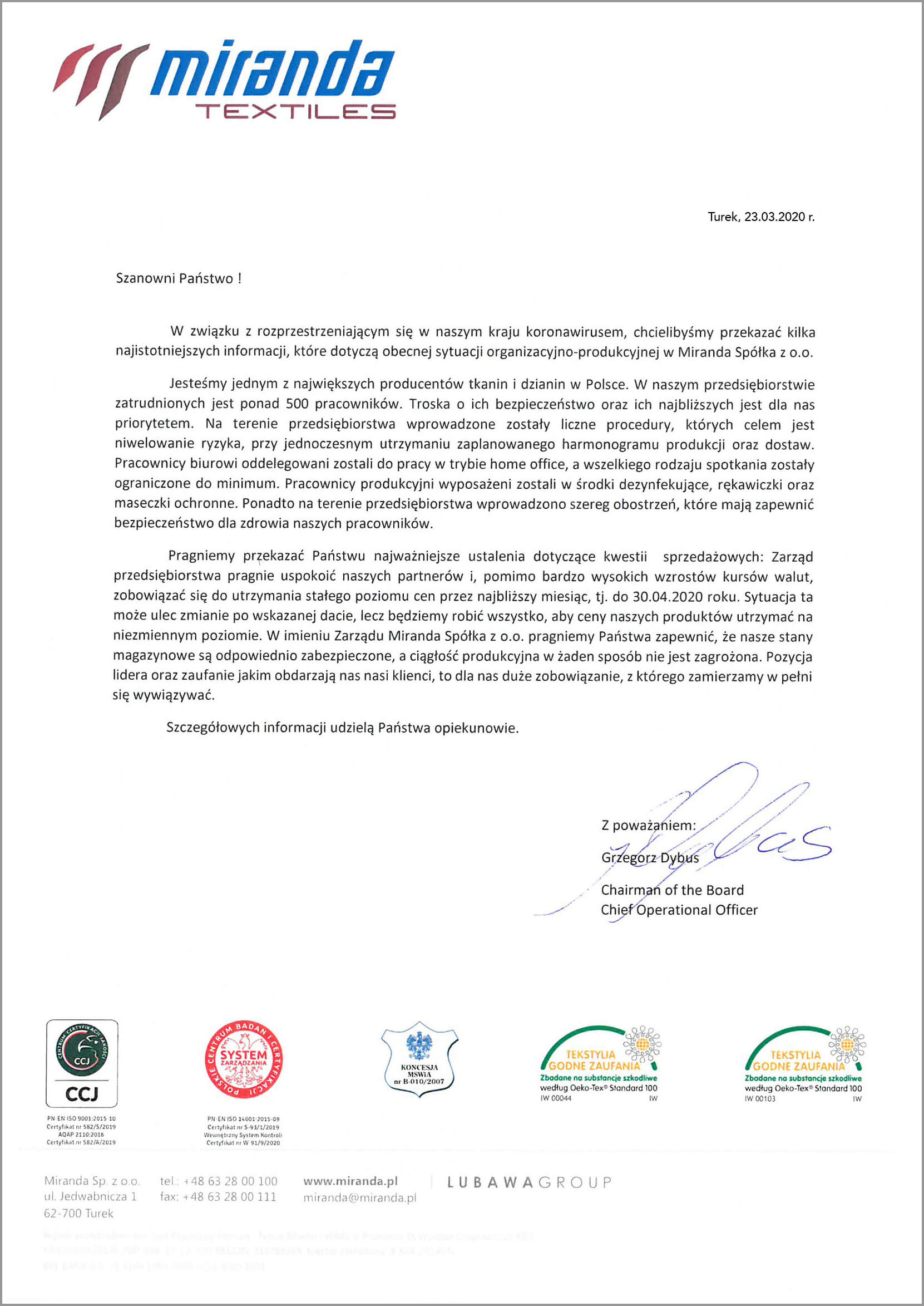 W związku z rozprzestrzeniającym się nie tylko w Polsce, ale i na całym świecie koronawirusem (COVID-19), pragniemy przekazać Państwu informacje organizacyjne oraz produkcyjne, dotyczące obecnej sytuacji w przedsiębiorstwie Miranda Spółka z o.o.