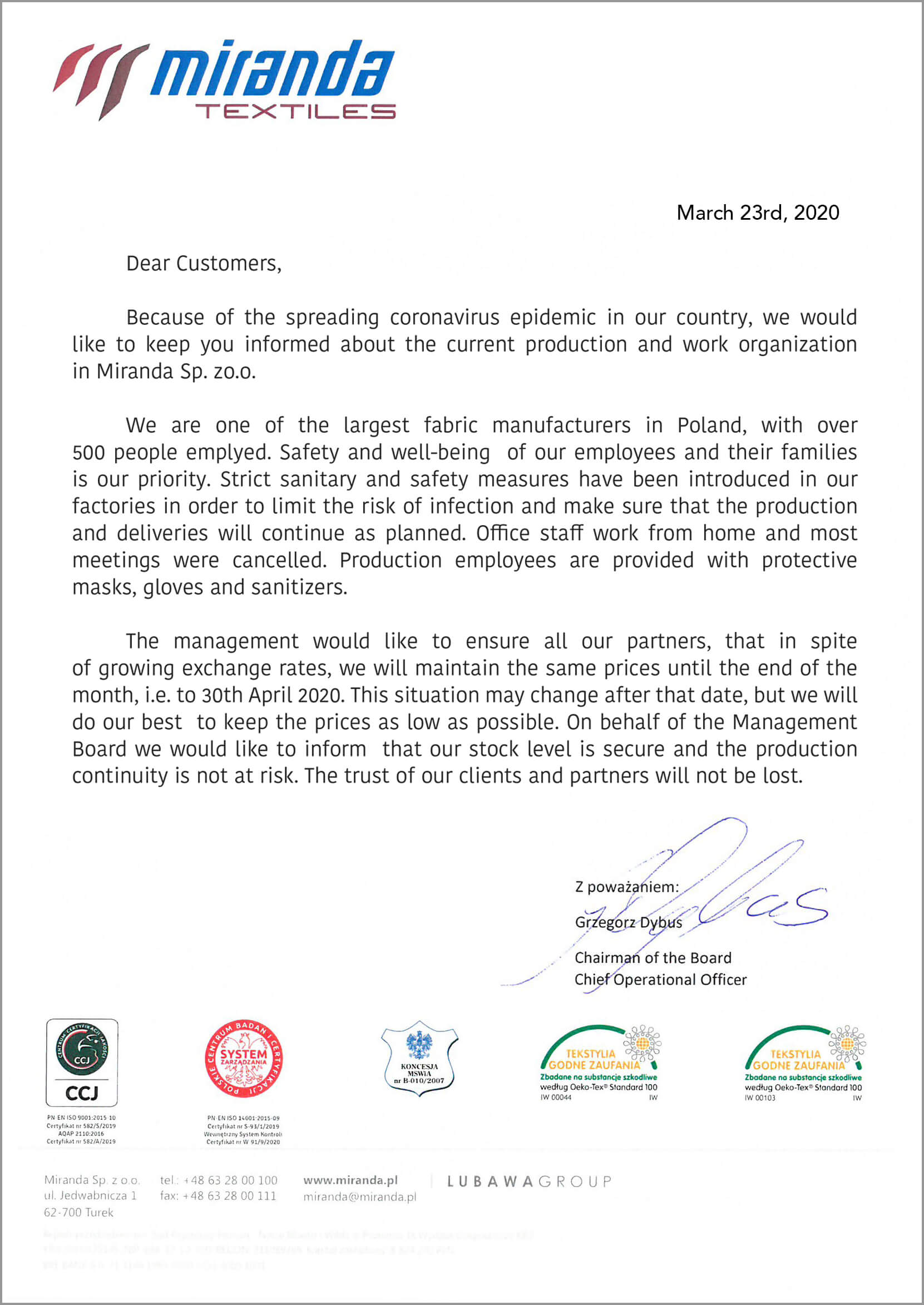 In regard to the coronavirus (COVID-19) spreading not only in Poland but all over the world, we would like to provide you with organizational and production information of current situation in Miranda Spółka z o.o.
